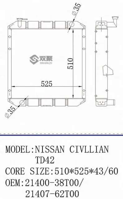 This high-quality new radiator is designed as a direct replacement for the Nissan Civilian TD42, matching the OEM specification 21407-62T00. It features a durable brass core, which provides excellent heat dissipation and corrosion resistance for reliable performance in your vehicle's cooling system. Engineered to ensure proper engine temperature regulation, this component helps maintain optimal operating conditions. The radiator is built to meet rigorous standards, offering a dependable solution for maintaining your automobile's cooling efficiency. It comes with the assurance of a one-year warranty, supporting your purchase with confidence. This part represents a solid value for vehicle maintenance and repair. Sourced from Hubei Shuangju Industry & Trade Co., Ltd., this radiator provides a cost-effective alternative for keeping your Nissan Civilian running smoothly. It is an essential component for anyone needing to service their cooling system with a quality-built part.