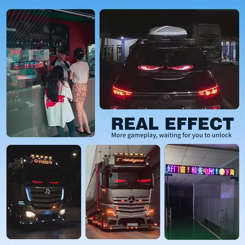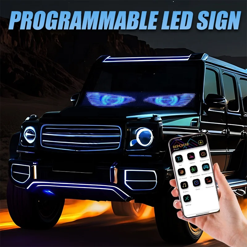 Transform your vehicle into a showstopper with this programmable digital display panel. Designed for windshields and windows, this unique LED matrix allows you to create custom scrolling text, pixel art, and eye-catching animations. Itâs perfect for adding a personal touch, promoting a business, or simply standing out from the crowd with fun designs like demon eyes or devil motifs. Easy to install and control via a dedicated app, the panel offers endless creative possibilities. Constructed with durable, bright LEDs, it ensures your messages are visible day or night. Ideal for trucks, cars, and special events, this accessory provides a dynamic new way to express yourself on the road. Make a statement wherever you drive.